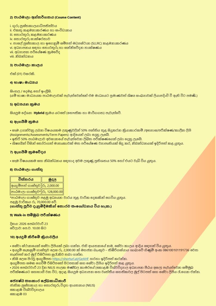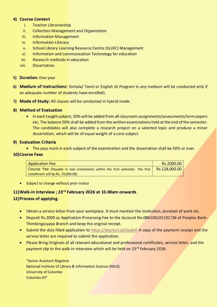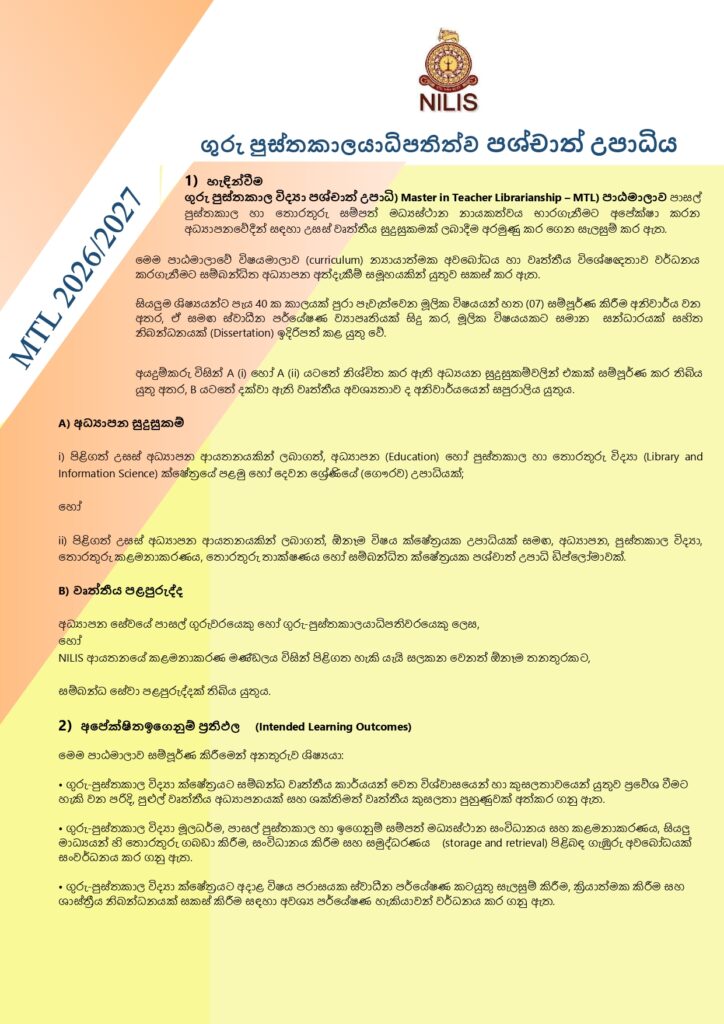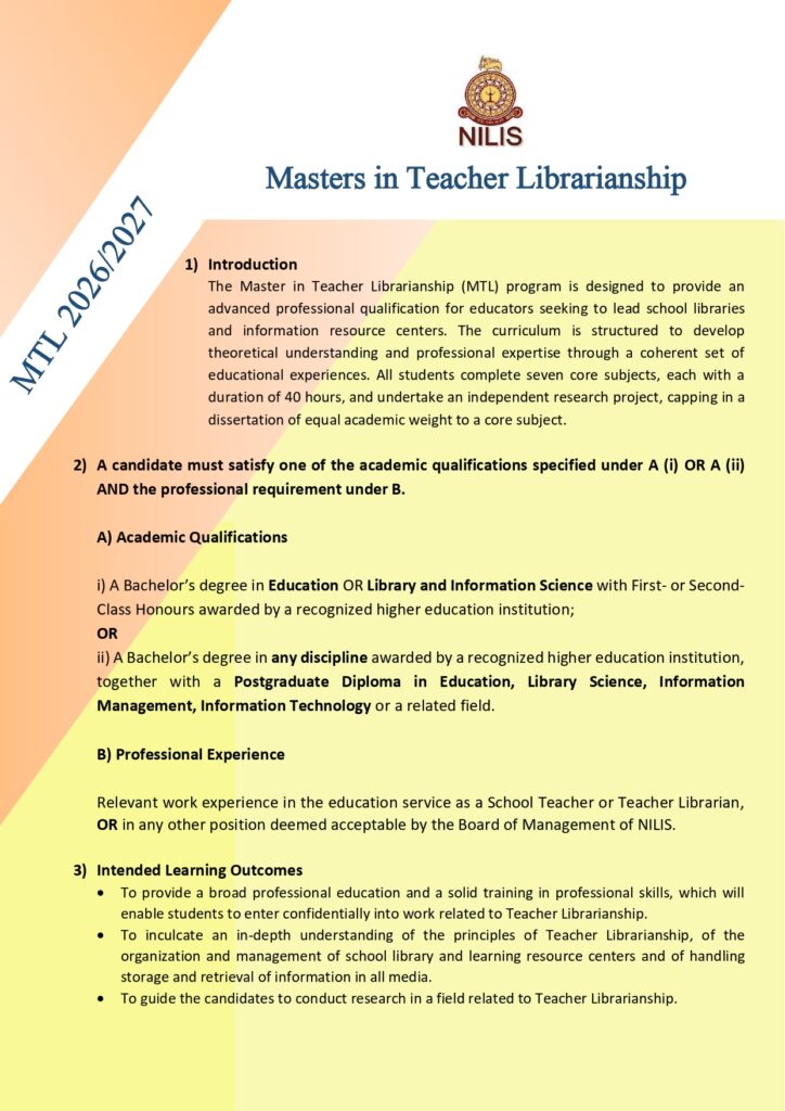 Categories Master Programs Apply Now Download Course Flyer - English Download Course Flyer - Sinhala Express of your interest of joining the walk in interview by providing details here Related Course Master in Information Management (MIM) Master of Library and Information Science (MLIS)