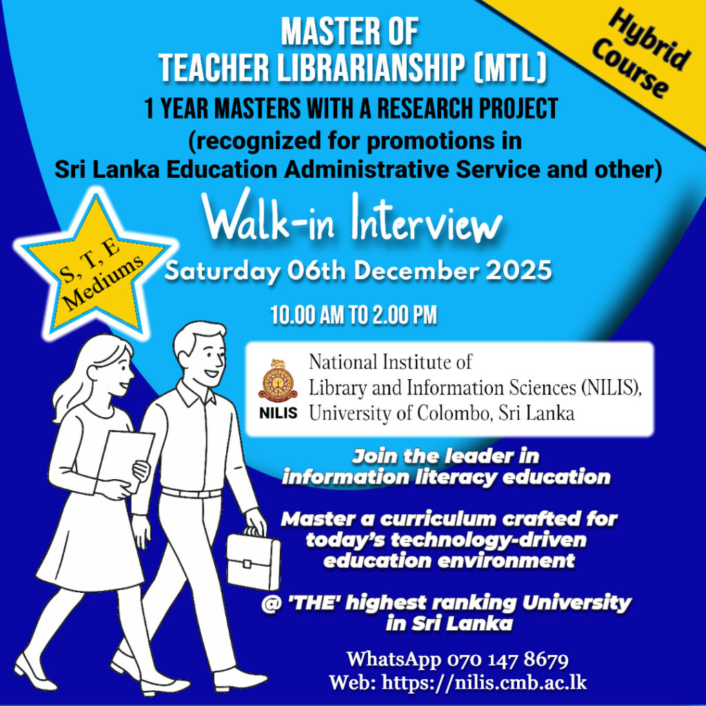 NILIS, University of Colombo, Sri Lanka, invites applications for the Master of Teacher Librarianship (MTL) program. The program is conducted primarily online, with selected lectures and assessments arranged on site for practical engagement. It is positioned at Level 9 of the Sri Lanka Qualifications Framework (SLQF) and is fully approved by the University Grants Commission [...]